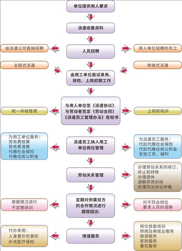 劳务派遣手续简便,用工单位与劳务派遣公司签订《劳务派遣合同》,提出派遣员工的需求(派遣员工可以由用工单位自行招聘,也可通过劳务派遣公司招聘),双方确定派遣人员名单,然后由劳务派遣公司办理用工手续。具体办理派遣手续程序如下: